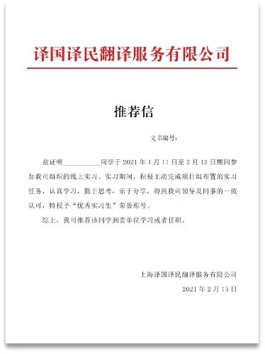 本次实习表现优异的实习生,还将收获优秀实习生专属实习证明和译国译民出具的推荐信!是不是有点小期待呢?(优秀实习生选拔标准和要求可查看实习群内文件)