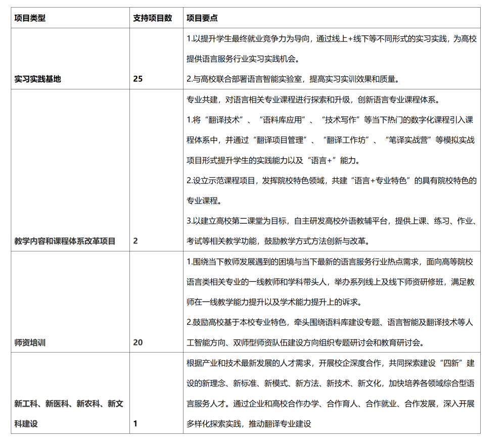 译国译民2022年申报开展的产学研协同育人项目中,包含“新工科、新医科、新农科、新文科建设项目”、“师资培训”、“教学内容和课程体系改革项目”以及“实习实践基地”四大类,设立48个项目,直接支持资金合计60万元。