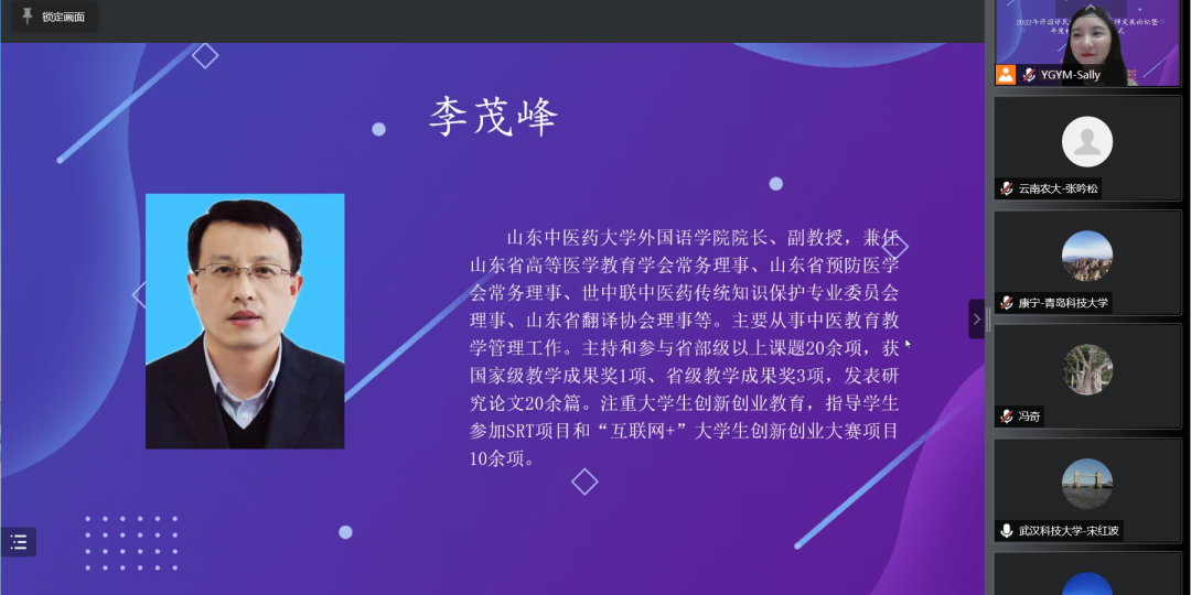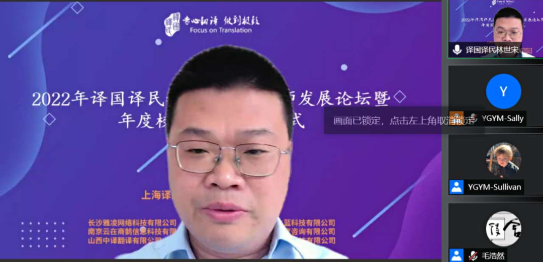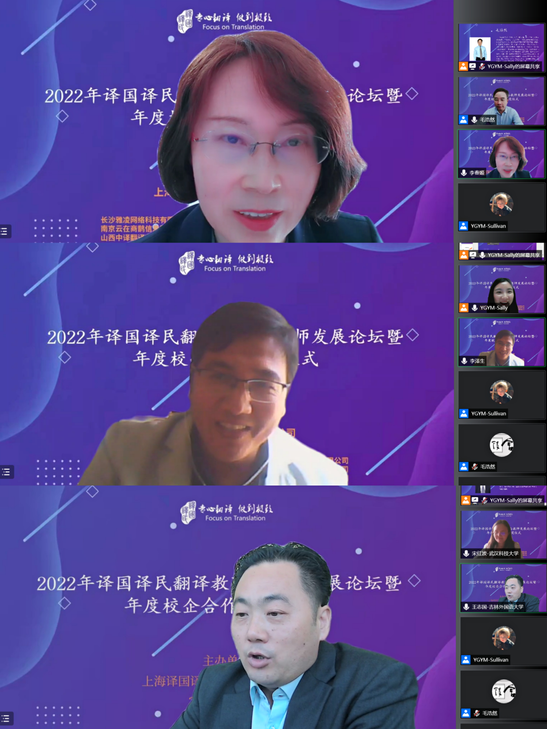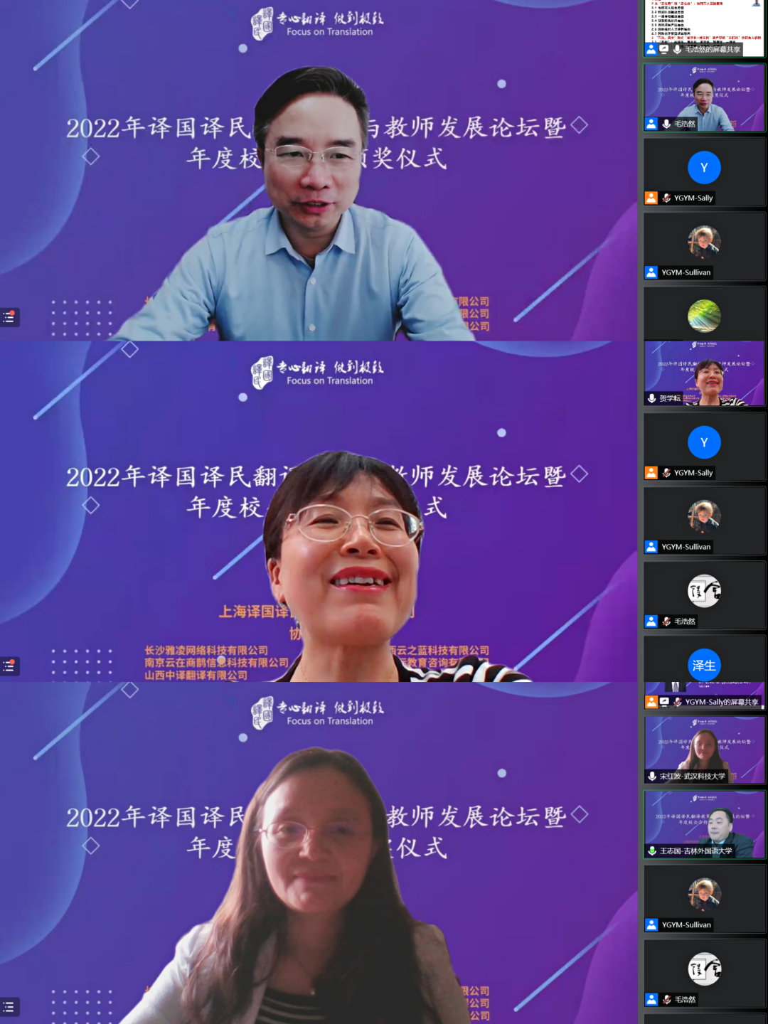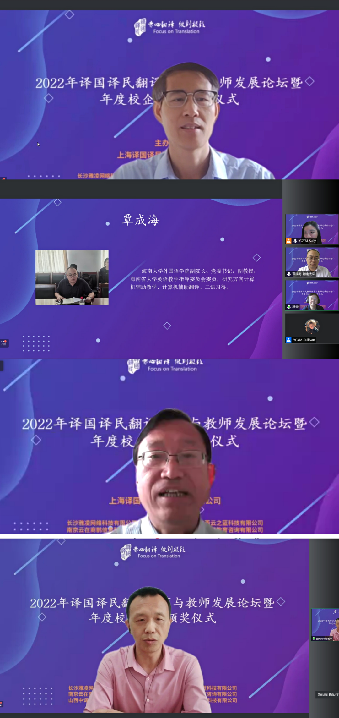 5月8日,2022年译国译民翻译教育与教师发展论坛暨年度校企合作颁奖仪式于云端会议室成功举办。本次研讨会由译国译民翻译服务有限公司主办,邀请重磅级专家学者团队,以“翻译教育与教师发展”为主题,利用腾讯会议平台,网络在线形式开展本次研讨活动。来自全国各地的高等院校领导及教师等共计逾900名嘉宾齐聚云端,共襄学术盛宴。华侨大学外国语学院陈文革副院长、海南大学外国语学院覃成海副院长、青岛科技大学外国语学院副院长康宁教授、暨南大学翻译学院副院长陈毅平教授、大连外国语大学高级翻译学院院长李春姬教授、昆明理工大学外国语言文化学院副院长李泽生副教授、吉林外国语大学校长助理兼高级翻译学院院长王志国教授为特邀主持嘉宾。