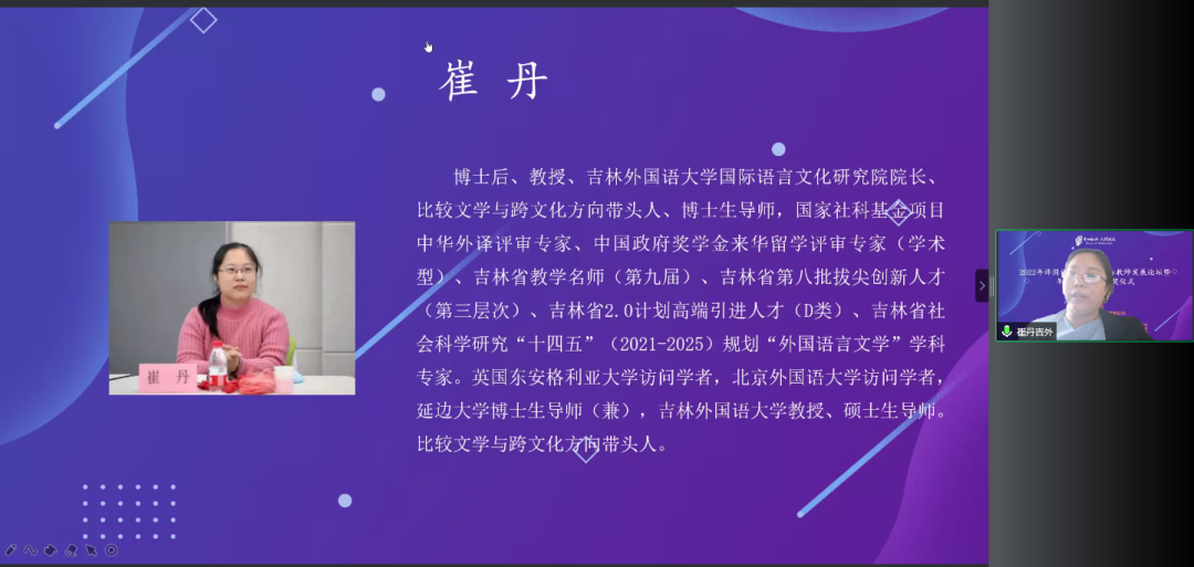专家们分享的内容精彩纷呈,群内发言踊跃、剖析入微,参会者表示收获颇丰。聚焦翻译教育、内容翔实思辨的研讨会接近尾声,吉林外国语大学国际语言文化研究院院长崔丹教授致闭幕辞,2022年译国译民翻译教育与教师发展研讨会暨年度校企合作颁奖仪式圆满落幕。
