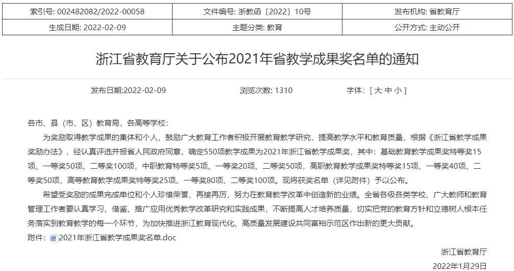 根据《浙江省教学成果奖励办法》评选并报省人民政府同意,2021年浙江省共确定550项教学成果为2021年浙江省教学成果奖,其中高等教育教学成果奖特等奖25项、一等奖80项、二等奖100项;基础教育教学成果奖特等奖15项、一等奖50项、二等奖100项;另有中职教育类和高职教育类成果奖共180项。