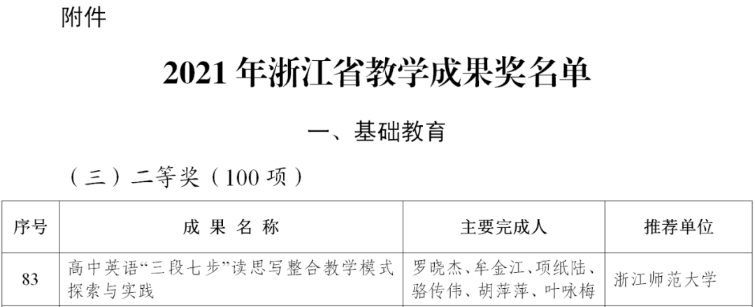 近日,浙江省教育厅公布了2021年浙江省教学成果奖获奖名单,浙江师范大学外语学院两项成果获奖。其中,“基于RICH理念的中学英语卓越教师培养模式15年探索与实践”获得高等教育类特等奖;“高中英语‘三段七步’读思写整合教学模式探索与实践”获得基础教育类二等奖。